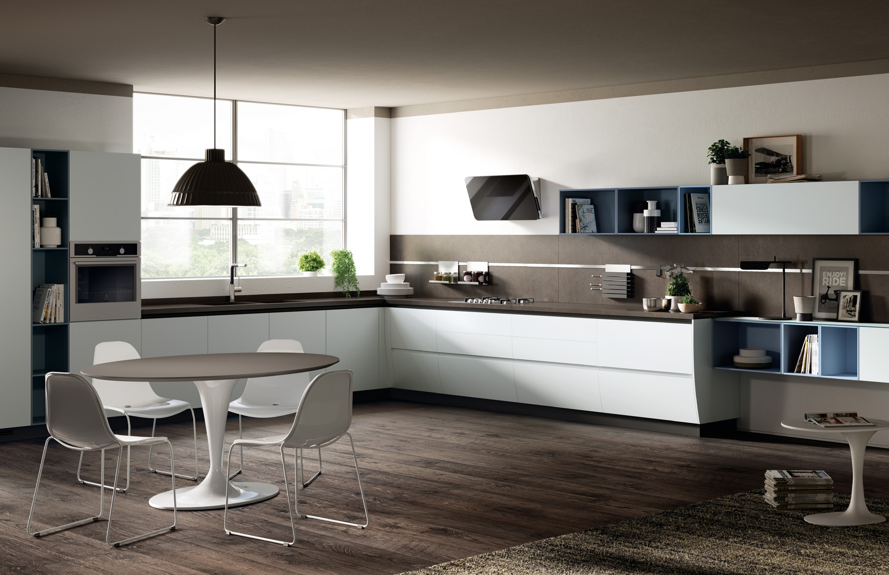 A New Concept in Shape Design for Spaces that Creates Clean Cut Purity in Aesthetics and Function. The Kitchen Easily Merges with the Living Room – Built Ins Define Spaces – Tomorrow has Arrived in Fierce Definition of the Modern View on the Kitchen Space.